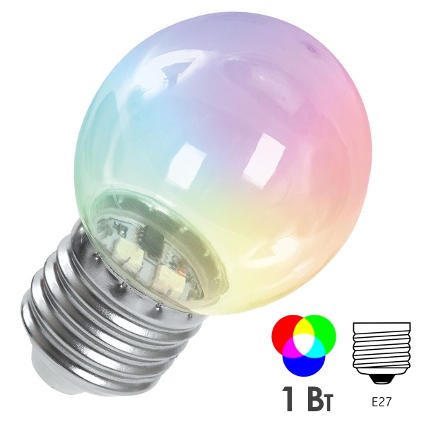 Светодиодная энергосберегающая лампочка для декоративного освещения, мощностью 1 Ватт, с цоколем E27, RGB свечение, прозрачная колба 38129