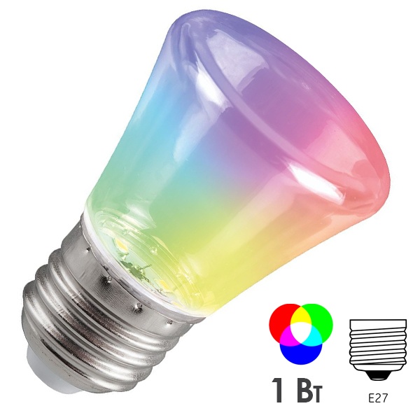 Лампа светодиодная FERON LB-372, C45 (колокольчик), 1W 230V E27 (RGB), рассеиватель прозрачный угол рассеивания 220, 70*45мм