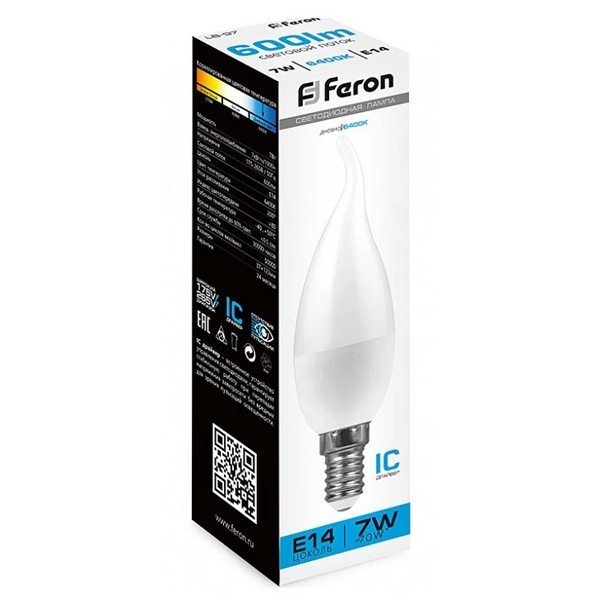 Лампа светодиодная FERON LB-570, C37T (свеча на ветру), 9W 230V E14 6400К (дневной), рассеиватель матовый белый, 840Lm, угол рассеивания 200, 124*37мм