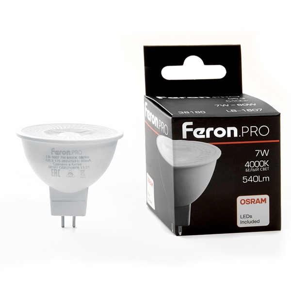 Лампа светодиодная FERON LB-1607, MR16 (рефлекторная), 7W 230V G5.3 4000К (белый), рассеиватель матовый белый, 540Lm, угол рассеивания 38, 49*50мм