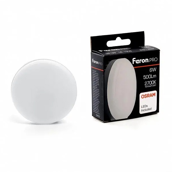 Лампа светодиодная FERON LB-1506, GX53 (таблетка), 6W 230V GX53 2700К (белый теплый), рассеиватель матовый белый, 500Lm, угол рассеивания 120, 73*26мм