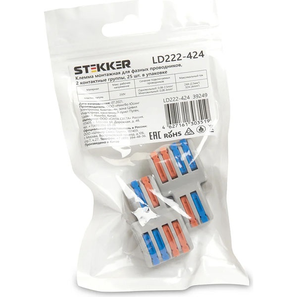 Клемма пружинная универсальная STEKKER LD222-424, 6-проводная 0,08 - 2,5/4 мм2, 400В, 24 A, 32 A, без пасты, материал изделия пластик, латунь. Тип провода одножильный/многожильный, материал провода медь, температура окружающей среды -20...+40C