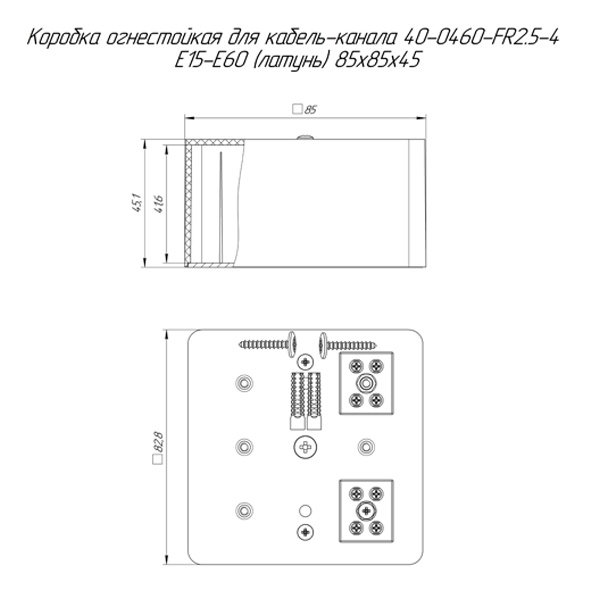 Монтажная коробка серии 40-0460-FR от известной компании Промрукав представляет собой белый огнеупорный бокс с гладкими стенками, который применяется при прокладке систем противопожарной безопасности по стенам и потолкам зданий. Он используется при прокладке кабель-канала и обладает степенью защиты IP42. Его основание в виде стальной пластины надежно крепится к поверхности стен и потолка, а защитная крышка затягивается винтом по центру конструкции. Основное назначение такой коробки состоит в механической защите мест соединения проводов и кабелей, а также для защиты внутреннего пространства от попадания пыли, влаги и посторонних предметов. Материалом изготовления корпуса служит термостойкий полимер, имеющий высокую устойчивость к воспламенению от нагретой проволоки до 650 градусов Цельсия, который, в свою очередь, не содержит галогенов и является безвредным для человека. Предел огнестойкости находится в диапазоне E15-E60. Максимальное сечение подключаемых проводов составляет 2.5 мм2. Компактная коробка имеет 4 полюса на 2 керамических колодках и обладает следующими габаритами: 85х85х45 мм. Она рассчитана на установку в сетях с применением огнестойких кабелей серии FR с рабочим напряжением до 750 Вольт и выдерживает температуру эксплуатации от -25 до 40 градусов Цельсия. В комплект поставки входит необходимый крепеж и инструкция по монтажу.