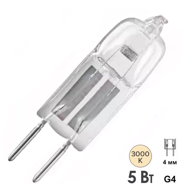 Капсульная галогенная лампа OSRAM HALOSTAR OVEN 5Вт с цоколем G4. Используется для духовок и печей. Работает от 12В. Лицензиатом торговой марки OSRAM в общем освещении является компания LEDVANCE.