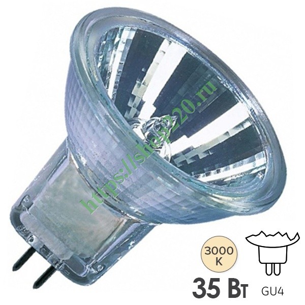 Лампа галогенная Осрам Декостар мощностью 35 Ватт, теплый белый свет, с цоколем GU4, 12 Вольт 4050300346182