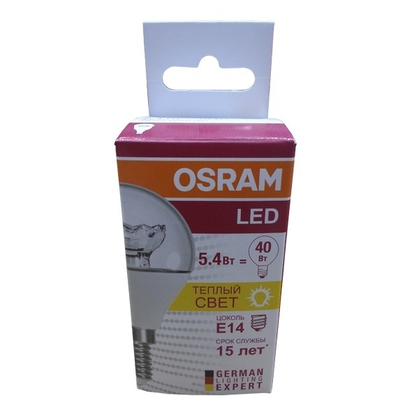Лампа светодиодная OSRAM LED Star P, 470лм, 5,4Вт (замена 40Вт), 3000К (теплый белый свет). Цоколь E14, колба P, угол пучка 240°. Исполнение колбы прозрачное, пластик. Напряжение питания 220-240В. Товар сертифицирован.
