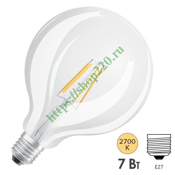 Светодиодная лампочка Осрам GLOBE 125, мощностью 7 Вт, с цоколем E27, теплый свет, прозрачная 4052899972773