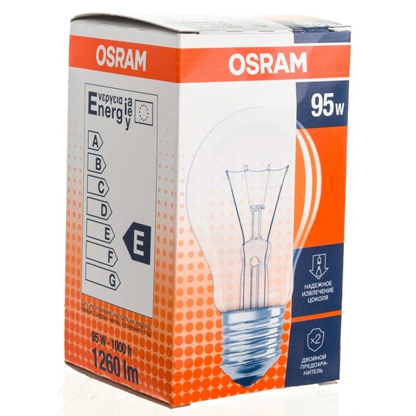 Лампа накаливания OSRAM формы груши 95Вт. Прозрачная колба, цоколь Е27. Лицензиатом торговой марки OSRAM в общем освещении является компания LEDVANCE.