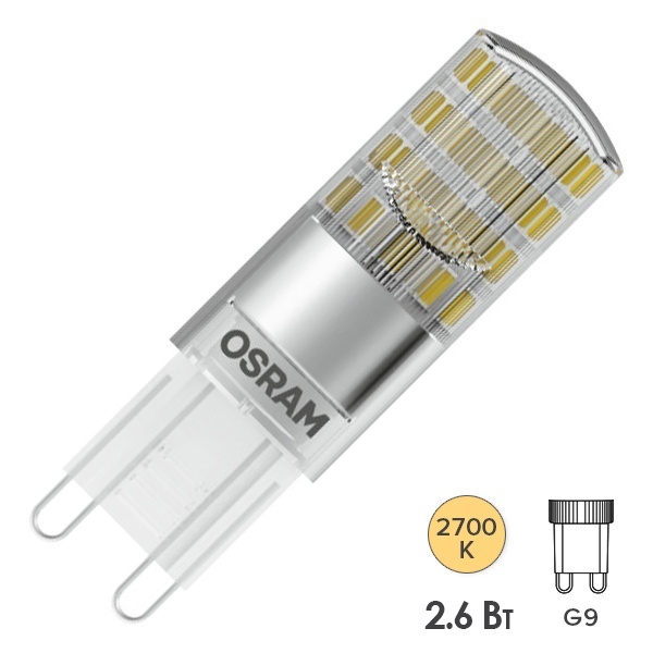 Лампа светодиодная OSRAM LED Star PIN, 320лм, 2,6Вт (замена 30Вт), 2700К (теплый белый свет). Цоколь G9, колба PIN, угол пучка 300°. Исполнение колбы прозрачное, пластик. Напряжение питания 220-240В. Товар сертифицирован.