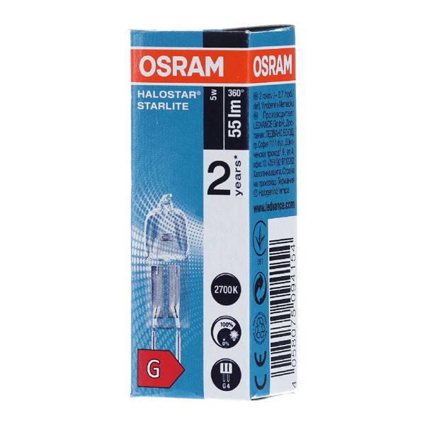 Капсульная галогенная лампа OSRAM HALOSTAR STARLITE 2000, 5Вт, цоколь G4. С УФ-фильтром. Подходит для акцентного освещения. Работает от 12 В. Лицензиатом торговой марки OSRAM в общем освещении является компания LEDVANCE.