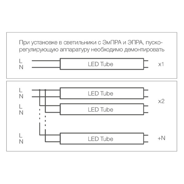 Требуется незначительное изменение электрической схемы светильника для корректной работы трубок. В решении от компании LEDVANCE используется так называемая односторонняя схема подключения: когда нулевой и фазный проводник подводятся только к промаркированной стороне светодиодной трубки.Светодиодные трубки Osram имеют полностью безопасное решение по подключению с одной стороны, в отличие от распространенных на территории РФ ламп других производителей (подключение с двух сторон), при котором существует риск поражения электрическим током (при прикосновении одновременно к штырькам цоколей разной полярности на обоих сторонах светодиодной трубки).