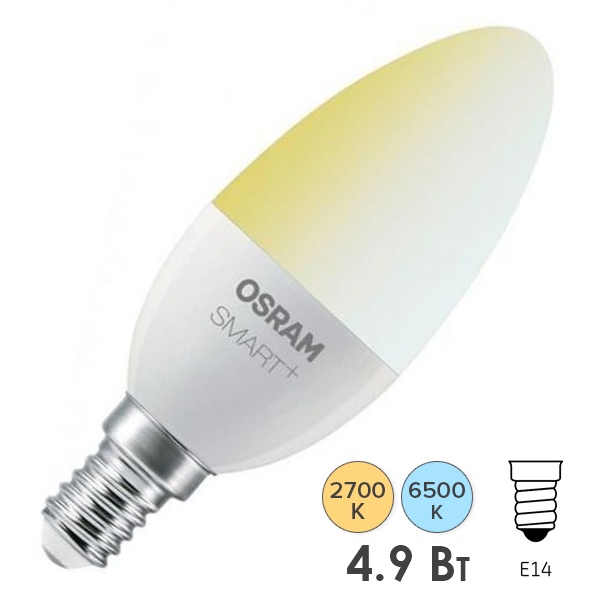 Светодиодная, диммируемая Смарт лампа формы свеча Ледванс, с изменением цветовой температуры (от теплого белого 2700К до холодного белого 6500К.), мощностью 4,9 Ватт, с цоколем E14 4058075208414