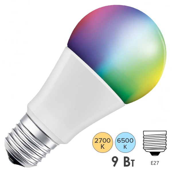 Светодиодная, диммируемая Смарт лампа Ледванс, с изменением цветовой температуры (от теплого 2700К до холодного белого 6500К.) и цветовых оттенков (до 16 миллионов), мощностью 9 Ватт, с цоколем E27 4058075208469