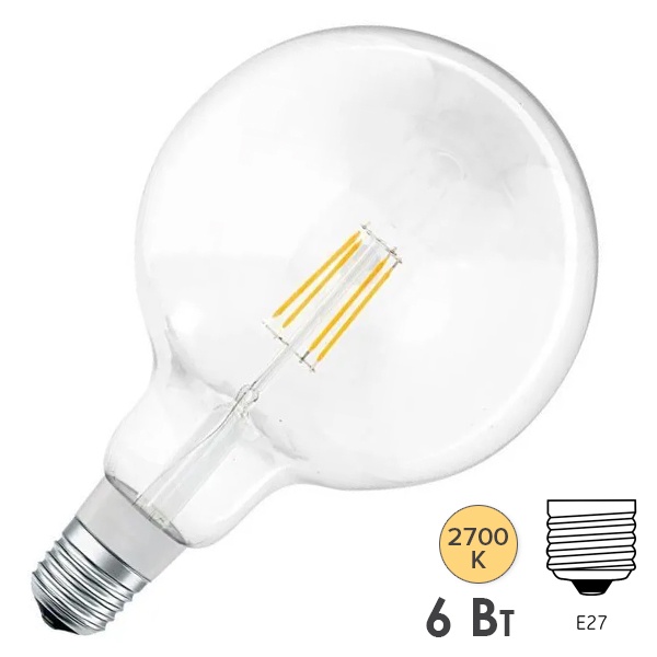 Филаментная, диммируемая Смарт лампа шар G125 Ледванс с нитевидными светодиодами, теплый свет, мощностью 6 Ватт, с цоколем E27, прозрачная колба 4058075208568