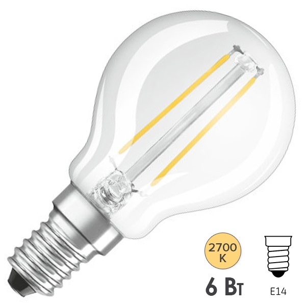 Филаментная лампочка Осрам с нитевидными светодиодами, мощностью 6 Ватт, с цоколем E14, тёплый свет 4058075218147