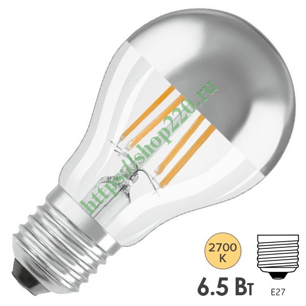 Лампа Osram CL A MIRROR 6.5W/827 230V FIL E27  650Lm d60x105mm Серебряное покрытие