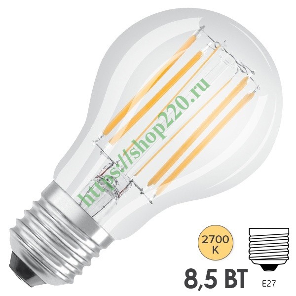 Диммируемая лампочка Груша Осрам с нитевидными светодиодами, мощностью 8,5 Ватт, с цоколем E27, теплый свет 4058075287587