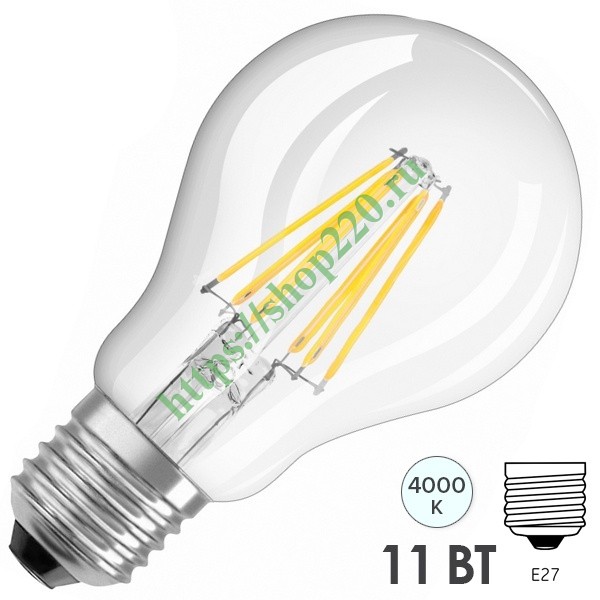 Филаментная лампочка Осрам с нитевидными светодиодами, мощностью 11 Ватт, с цоколем E27, нейтральный белый свет 4058075288621