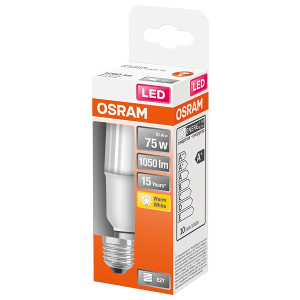 Лампа светодиодная OSRAM LED Star Stick, 1050лм, 10Вт (замена 75Вт), 2700К (теплый белый свет). Цоколь E27, колба Stick, угол пучка 200°. Исполнение колбы матовое, пластик. Напряжение питания 220-240В. Товар сертифицирован.