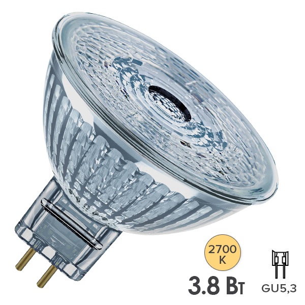 • Лампа светодиодная LEDS MR16 3,8W/827 (35W) 12V GU5.3 36° 350Lm стекло теплый свет Osram