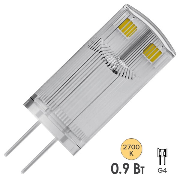 Диммируемая, капсульная, низковольтная, светодиодная лампочка Осрам, мощностью 0,9 Ватта с цоколем G4, теплый свет 4058075431935