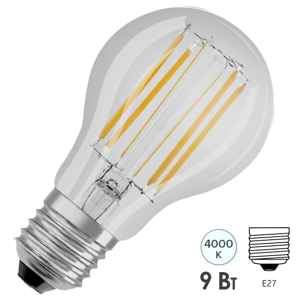 Лампа филаментная диммируемая светодиодная OSRAM LED Star A, 1055лм, 9Вт (замена 75Вт), 4000К (нейтральный белый свет). Цоколь E27, колба A, угол пучка 320°. Исполнение колбы прозрачное, стекло. Напряжение питания 220-240В. Товар сертифицирован.