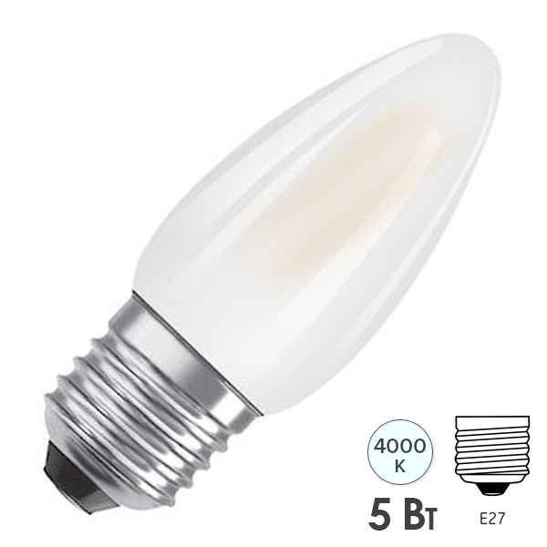 Диммируемая лампочка формы свеча Осрам с нитевидными светодиодами, мощностью 5 Ватт с цоколем E27, теплый свет, матовая колба 4058075435025