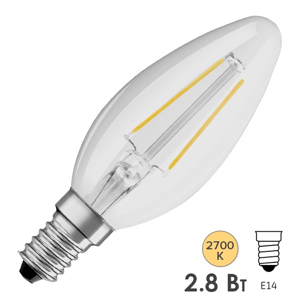 Диммируемая лампочка формы свеча Осрам с нитевидными светодиодами, мощностью 2,8 Ватт с цоколем E14 (миньон), теплый свет, прозрачная колба 4058075436824