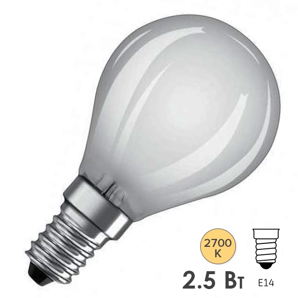 Филаментная лампочка шарик Осрам с нитевидными светодиодами, мощностью 2,5 Ватт, с цоколем E14 (миньон), теплый свет, матовая колба 4058075438675