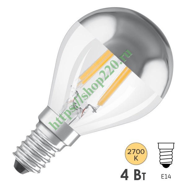 Лампочка Осрам с нитевидными светодиодами, мощностью 4 Ватта, с цоколем E14, теплый свет, с зеркальным отражателем 4058075439474