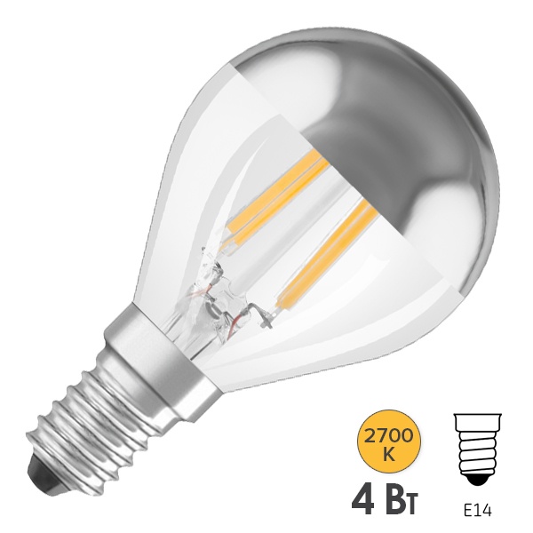Лампочка Осрам с нитевидными светодиодами, мощностью 4 Ватта, с цоколем E14, теплый свет, с зеркальным серебрянным отражателем 4058075447134