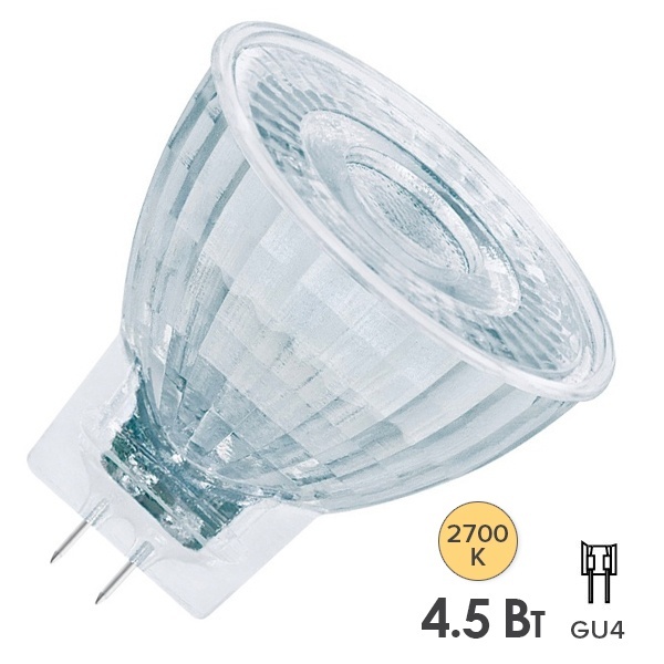 Светодиодная, низковольтная, лампочка акцентного освещения Осрам, мощностью 4,5 Ватт, с цоколем GU4, теплый свет
