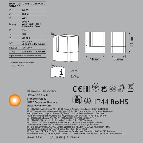 Светильник для установки на фасадах 9,5Вт 450 Лм, 3000 К RGBW SMART OUTD WIFI CUBE WALL RGBW DG LEDV. Совместим с приложением LEDVANCE SMART+ для Android и iOS