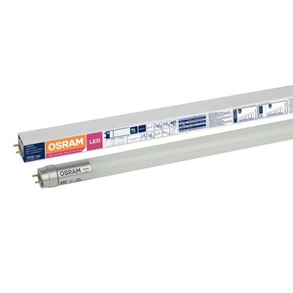 Лампа светодиодная OSRAM SubstiTUBE T8, 1800лм, 20Вт (замена 58Вт), 4000К (нейтральный белый свет). Цоколь G13, колба T8, угол пучка 180°. Исполнение колбы матовое, стекло. Напряжение питания 220-240В. Особенности: Сеть; 2-стор. подключение. Товар сертифицирован.