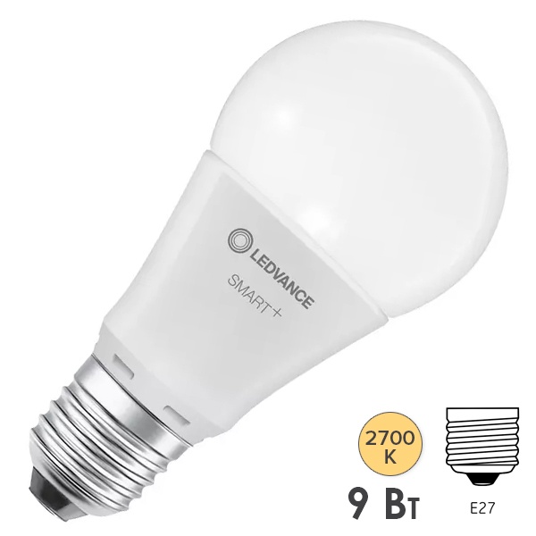 Светодиодная диммируемая WiFi (вайфай) смарт лампочка Ледванс, мощностью 9 Ватт, с цоколем E27, теплый свет 4058075485358