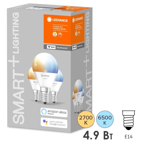 Светодиодная, диммируемая Смарт вайфай лампа шарик Ледванс, с изменением цветовой температуры (от теплого 2700К до холодного белого 6500К.), мощностью 4,9 Ватт, с цоколем E14, матовая колба, упаковка 3 штуки 4058075485976