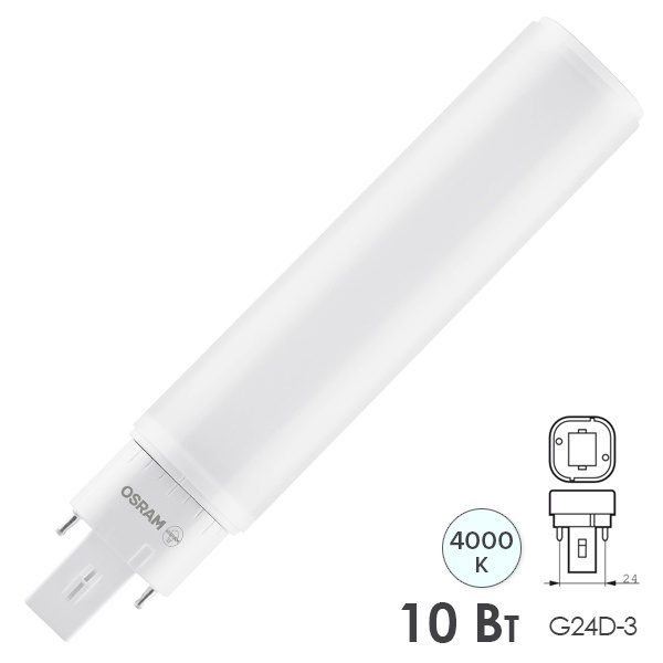 Лампа светодиодная OSRAM LED Dulux Special, 1100лм, 10Вт (замена 26Вт), 4000К (нейтральный белый свет). Цоколь G24d-3, колба Special, угол пучка 120°. Исполнение колбы прозрачное, пластик. Напряжение питания 220-240В. Товар сертифицирован.