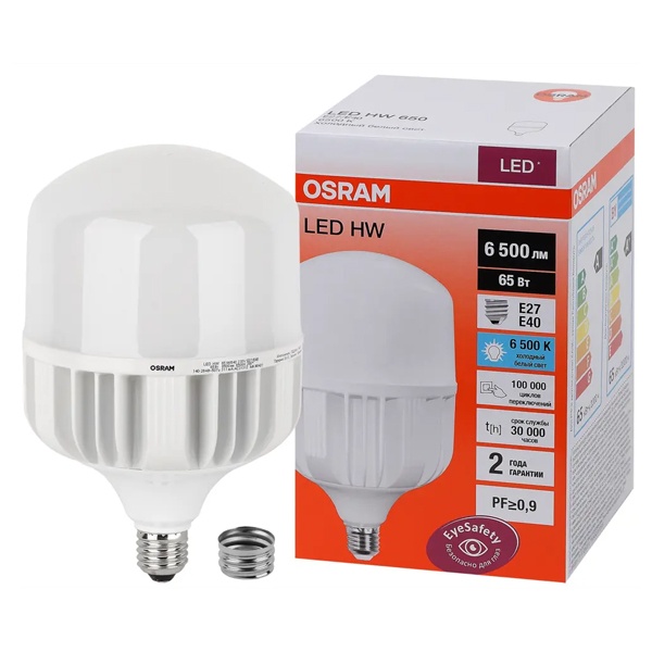 Лампа светодиодная OSRAM LED HW T, 6500лм, 65Вт (замена 650Вт), 6500К (холодный белый свет). Цоколь E27/E40, колба T, угол пучка 200°. Исполнение колбы матовое, алюминий. Напряжение питания 140-265В. Особенности: PF?0,9. Товар сертифицирован.