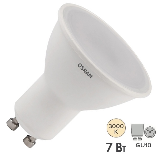 Лампа светодиодная OSRAM LED Value PAR16, 560лм, 7Вт (замена 60Вт), 3000К (теплый белый свет). Цоколь GU10, колба PAR16, угол пучка 110°. Исполнение колбы матовое, пластик. Напряжение питания 220-240В. Товар сертифицирован.
