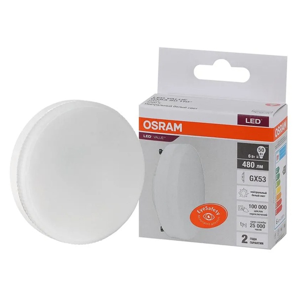 Лампа светодиодная OSRAM LED Value GX, 480лм, 6Вт (замена 50Вт), 4000К (нейтральный белый свет). Цоколь GX53, колба GX, угол пучка 110°. Исполнение колбы матовое, пластик. Напряжение питания 220-240В. Товар сертифицирован.