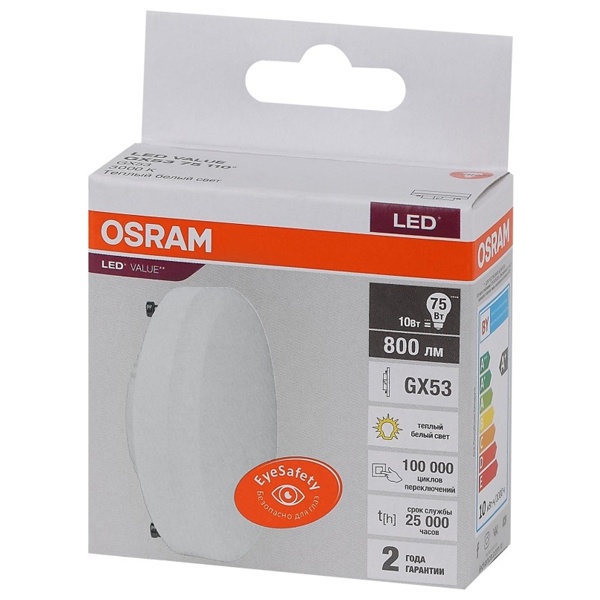 Лампа светодиодная OSRAM LED Value GX, 960лм, 12Вт (замена 100Вт), 6500К (холодный белый свет). Цоколь GX53, колба GX, угол пучка 110°. Исполнение колбы матовое, пластик. Напряжение питания 220-240В. Товар сертифицирован.