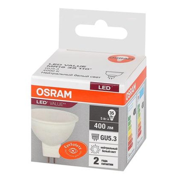 Лампа светодиодная OSRAM LED Value MR16, 400лм, 5Вт (замена 35Вт), 4000К (нейтральный белый свет). Цоколь GU5.3, колба MR16, угол пучка 110°. Исполнение колбы матовое, пластик. Напряжение питания 220-240В. Товар сертифицирован.