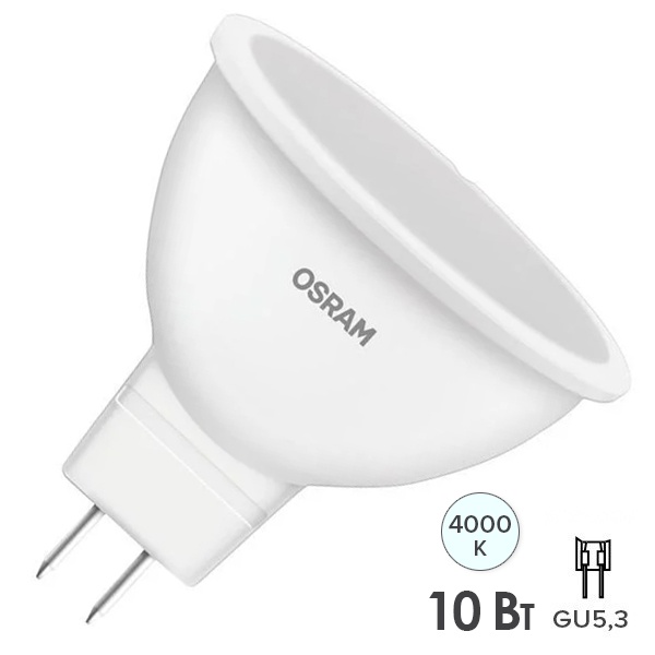 Лампа светодиодная OSRAM LED Value MR16, 800лм, 10Вт (замена 75Вт), 4000К (нейтральный белый свет). Цоколь GU5.3, колба MR16, угол пучка 110°. Исполнение колбы матовое, пластик. Напряжение питания 220-240В. Товар сертифицирован.