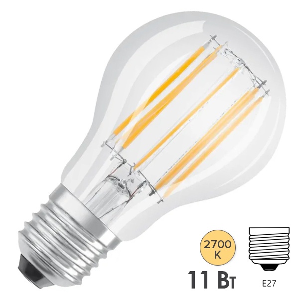 Филаментная, диммируемая лампочка Груша Осрам мощностью 11 Ватт с нитевидными светодиодами, с цоколем E27, теплый свет, прозрачная колба 4058075590878