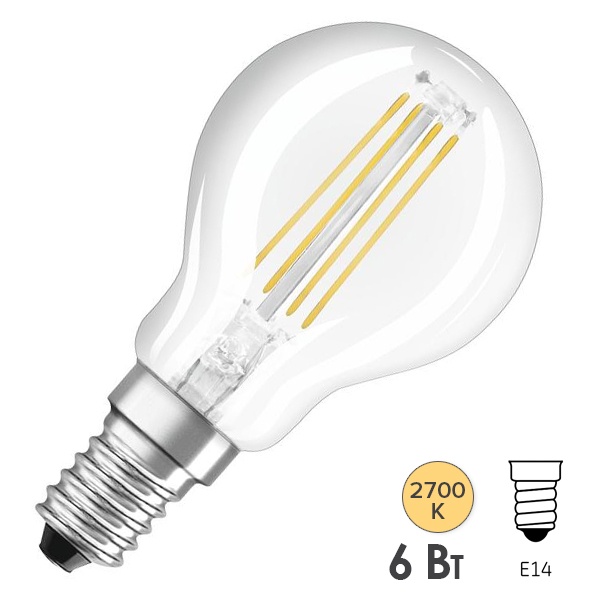 Филаментная лампочка шарик с нитевидными светодиодами Осрам, мощностью 6 Ватт, с цоколем E14, нейтральный белый свет, прозрачная колба 4058075590977