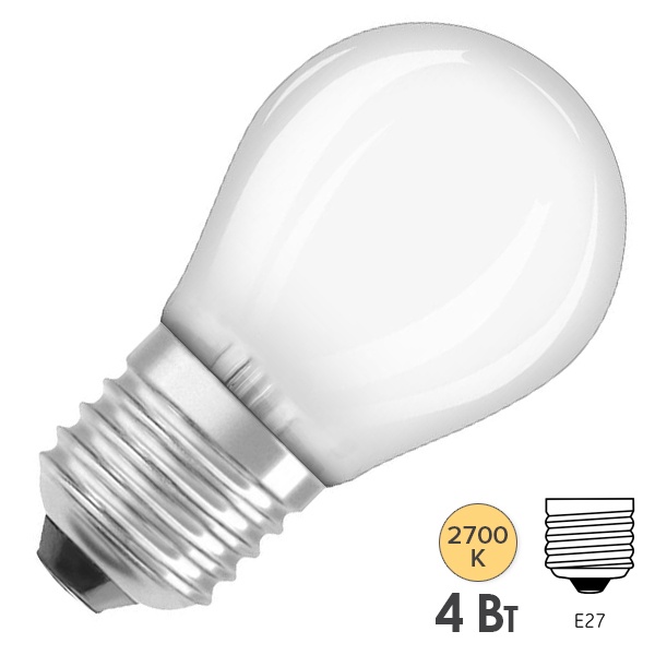 Лампа филаментная светодиодная OSRAM Parathom P, 470лм, 4Вт (замена 40 Вт), 2700К (теплый белый свет). Цоколь E27,колба P, угол пучка 300°. Исполнение колбы матовое, стекло. Напряжение питания 220-240В. Товар сертифицирован