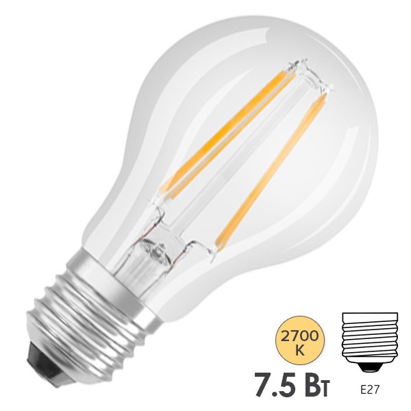 Лампа светодиодная филаментная диммируемая OSRAM LED Superstar, 1055лм, 7,5Вт (замена 75Вт), 2700К (теплый белый свет). Цоколь E27, колба A, угол пучка 320°. Исполнение колбы прозрачное, стекло. Напряжение питания 220-240В. Товар сертифицирован.