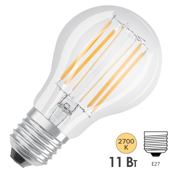 Лампа светодиодная филаментная диммируемая OSRAM LED Superstar, 1521лм, 11Вт (замена 100Вт), 2700К (теплый белый свет). Цоколь E27, колба A, угол пучка 320°. Исполнение колбы прозрачное, стекло. Напряжение питания 220-240В. Товар сертифицирован.