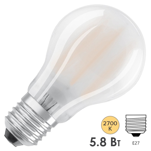 Энергосберегающая диммируемая LED лампочка с нитевидными светодиодами Груша с цоколем E27, мощностью 5,8 Ватт, теплый свет, матовая колба 4058075602571