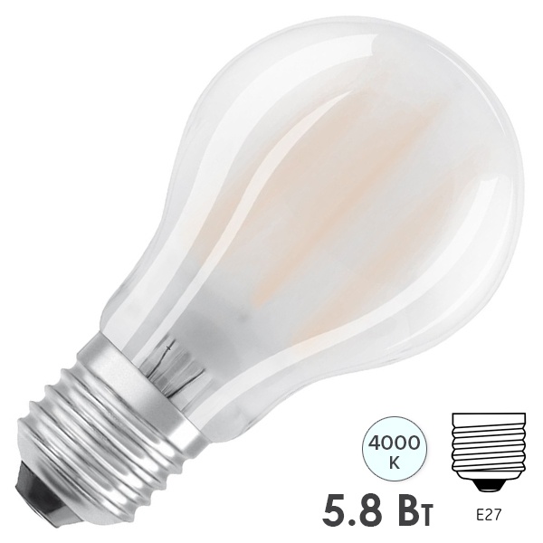 Энергосберегающая диммируемая LED лампочка с нитевидными светодиодами Груша с цоколем E27, мощностью 5,8 Ватт, нейтральный белый свет, матовая колба 4058075602595